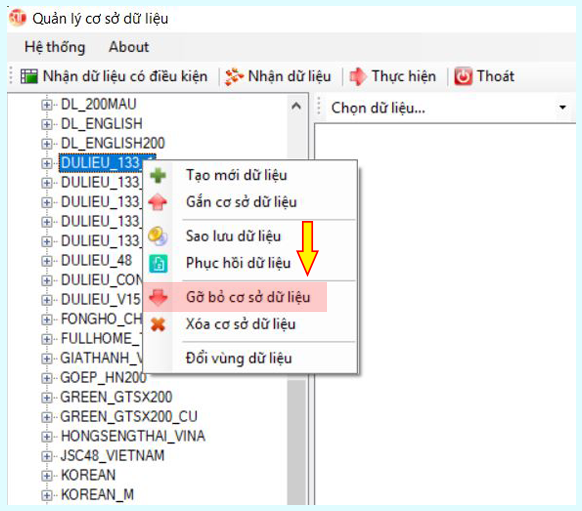 - Nhấn chuột phải hiện danh sách chức năng. Khách hàng chọn Gỡ cơ sở dữ liệu hoặc Xóa bỏ cơ sở dữ liệu.
