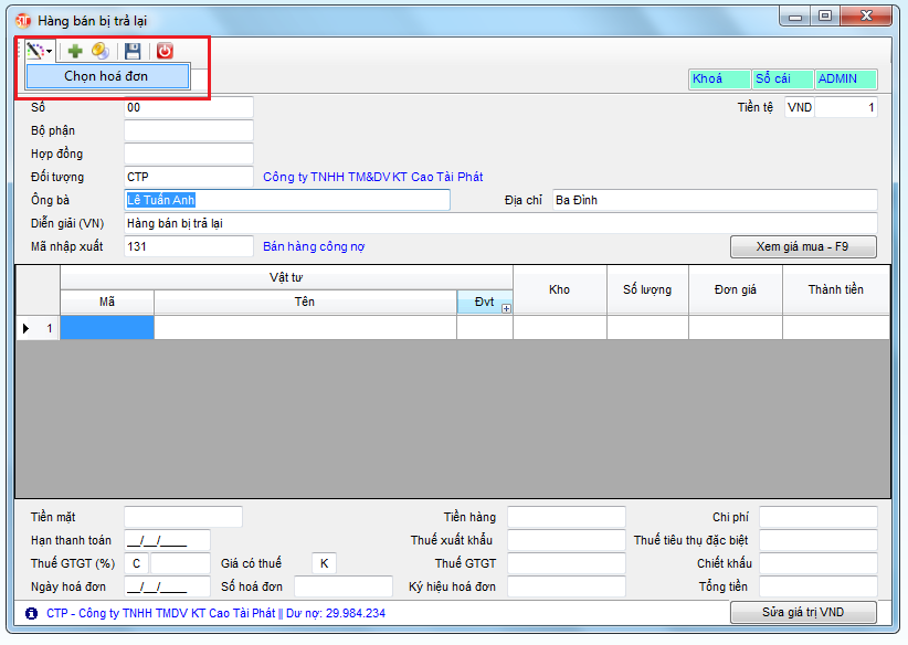 Để lấy thông tin hàng bán bị trả lại, khách hàng ấn Chọn Hóa Đơn.