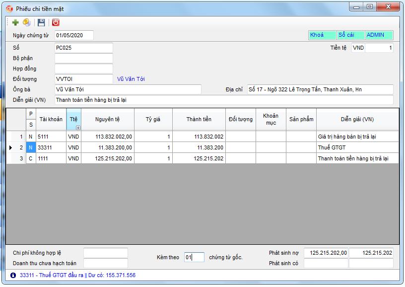 Bước 3. Khách hàng vào Kế toán tiền mặt tiền gửi, chọn phiếu Chi để hạch toán giá trị hàng bị trả lại.
